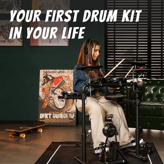 Electric Drum Set with 4 Quite Mesh Drum Pads, 3 Full Rubber Crashes, Bass Drum, 12 Kits and 68 Authentic Sounds,2 Pedals